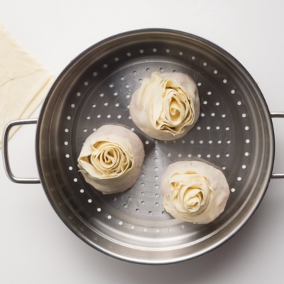 Как только вода в мантышнице закипит, поставить все листы сверху и закрыть крышкой.