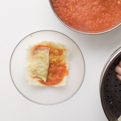 Готовый, еще горячий ханум укладывать слоями, поливая каждый слой ханума горячим соусом.