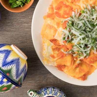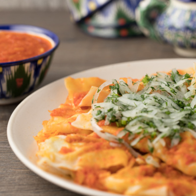 Тонкое тесто прямоугольничками и незатейливая начинка из картофеля и лука, с томатным соусом — простое, но очень вкусное блюдо!  С помощью нашего подробного фоторецепта его сможет приготовить любой, даже самый неопытный кулинар. Раскроем вам все маленькие секреты и тонкости приготовления базарного ханума. Как готовится тесто для любого вида ханума — мы писали тут.