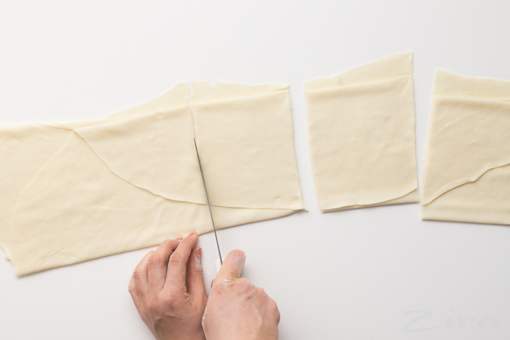 Тесто раскатать тонко, толщиной в 1 миллиметр, и разрезать на квадратики.
