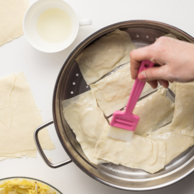 Выкладывать ханум можно в несколько слоев, обильно смазывая каждый слой маслом.