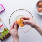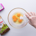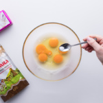 Добавить сухую смесь в яичную маленькими порциями, при этом аккуратно перемешивая лопаткой движениями снизу-вверх. Чем аккуратнее вы это сделаете, тем выше поднимется бисквит.
