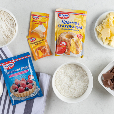 В чашу с мукой добавить крахмал, разрыхлитель и перемешать.