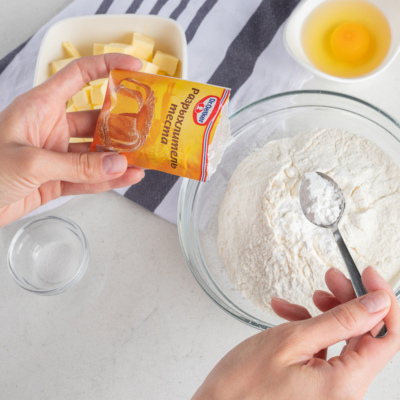 В чашу с мукой добавить соль, разрыхлитель и перемешать.