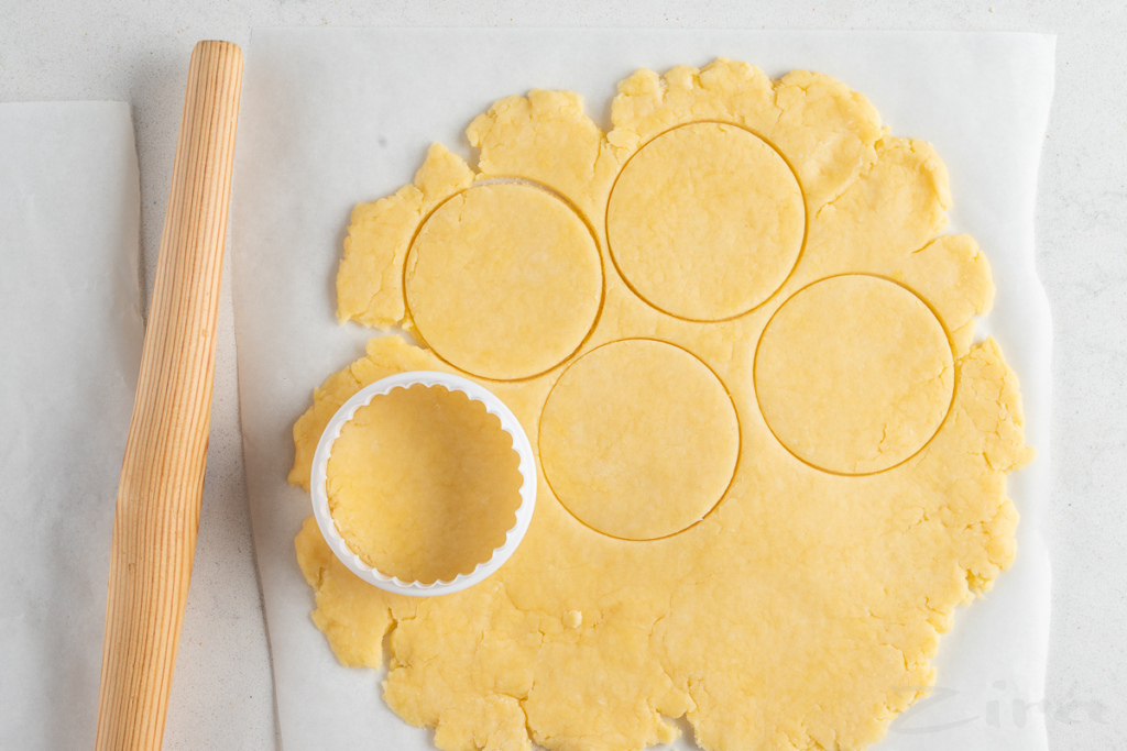 Достать тесто из холодильника, раскатать между двумя листами пергамента толщиной 0,7 сантиметров. Вырезать печенья с помощью круглой формы диаметром 8 сантиметров.