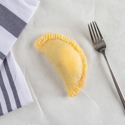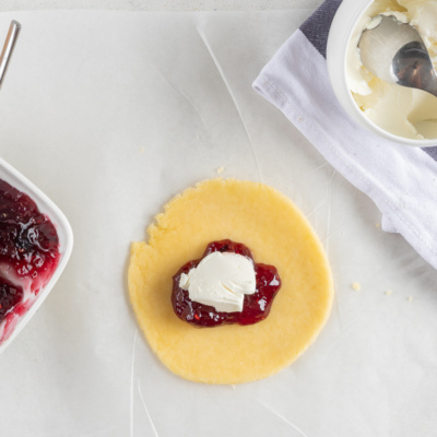 В центр выложить по 1 чайной ложке начинки (джем, творожный сыр), залепить и вилкой аккуратно придавить края.