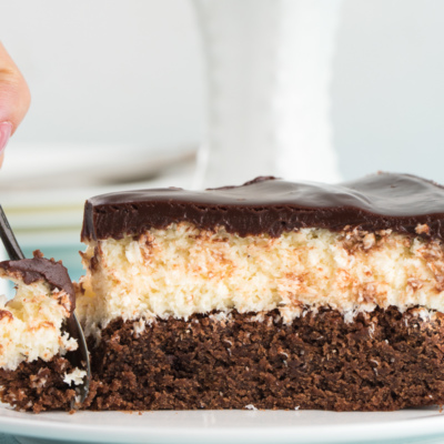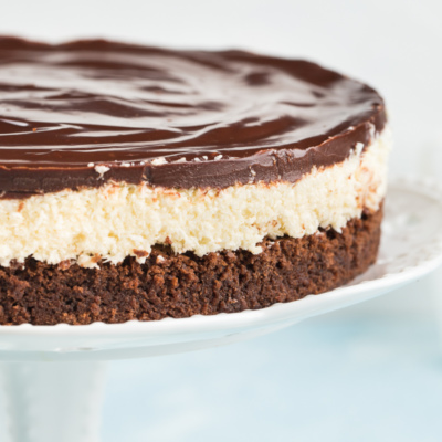 Торт состоит из мягкого бисквита, гладкой шоколадной глазури и, конечно же, густой прослойки с кокосовой стружкой.
