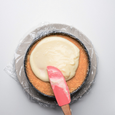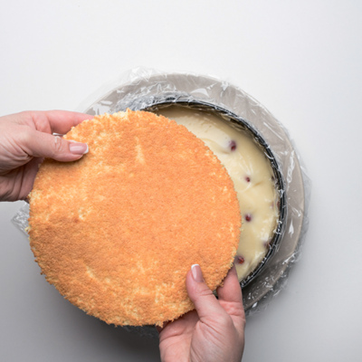 Борт разъемной формы диаметром 22 сантиметра обернуть пищевой пленкой.