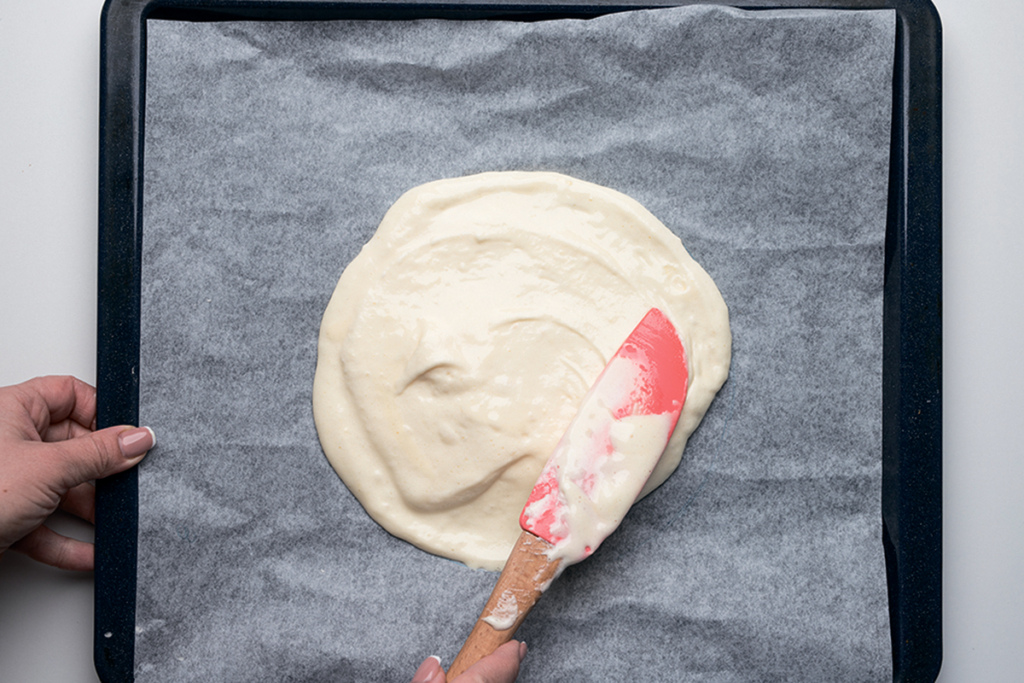 Половину теста выложить на очерченный круг, слегка выходя за края круга, разровнять. Отправить в разогретую до 190 С духовку на 12-14 минут.