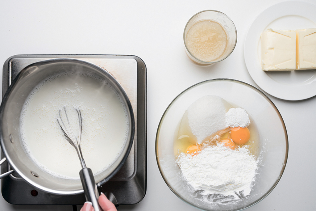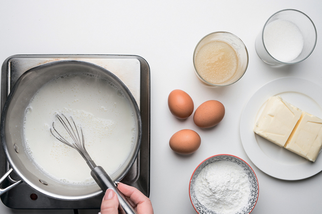 Горячее молоко тонкой струйкой влить в яичную смесь, постоянно помешивая венчиком, чтобы не образовались комочки.