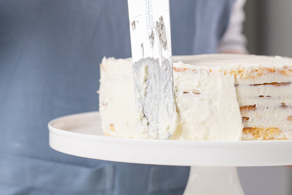 Коржи полностью остудить. Если корж получился слишком толстый, можно аккуратно срезать лишнее с помощью ножа.
