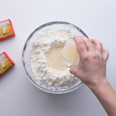 Внутри маслянно-мучной смеси сделать углубление, вылить туда содержимое стакана.