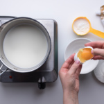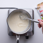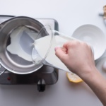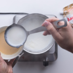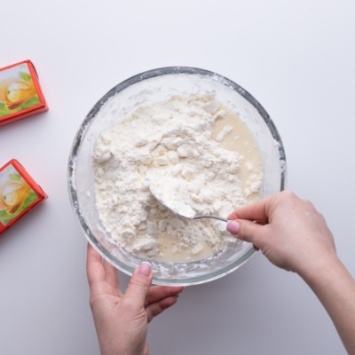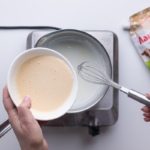 Интенсивно помешивая яичную смесь венчиком, влить в нее немного горячего молока.