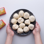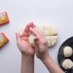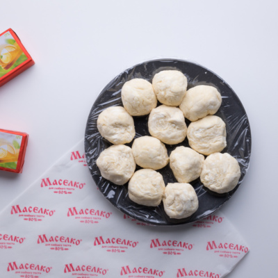 Тесто разделить на 10-12 частей и скатать из них шарики, накрыть пищевой пленкой и убрать на 1 час в холодильник.