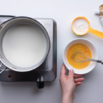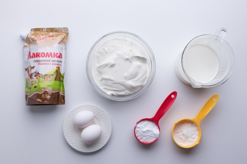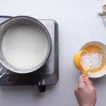 Молоко вылить в кастрюлю и разогреть. В миске тщательно смешать яйца с крахмалом, чтобы не было комочков.