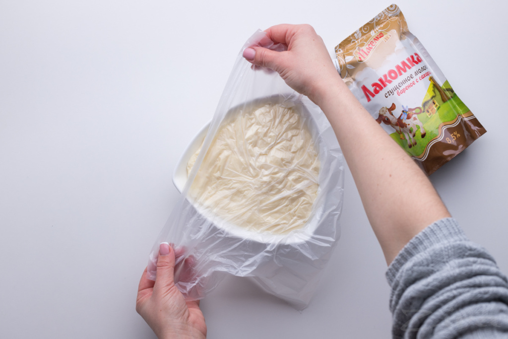 Снять крем с огня и дать ему полностью остыть. Можно переложить крем в другую емкость, накрыть пленкой(чтобы пленка касалась поверхности крема) и охладить крем в холодильнике.