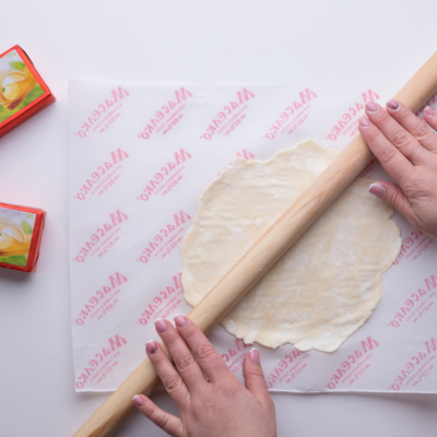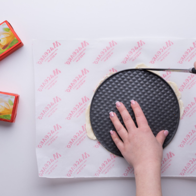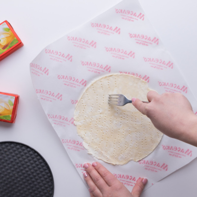 С помощью тарелки или формы для выпечки вырезать круг диаметром 22 сантиметра и наколоть тесто вилкой.