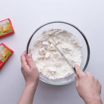Просеять в подходящую по объему посуду пшеничную муку и с помощью ножа измельчить в ней ледяное масло.