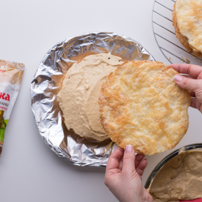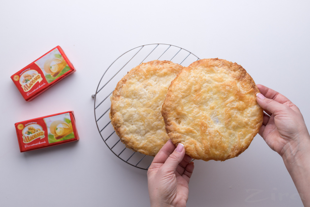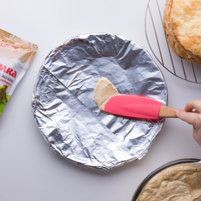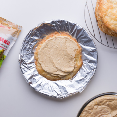 Выпекать коржи в разогретой до 210 С духовке до золотистого цвета.