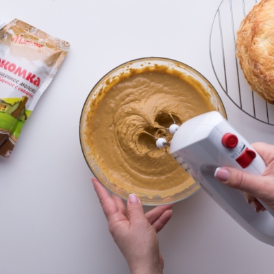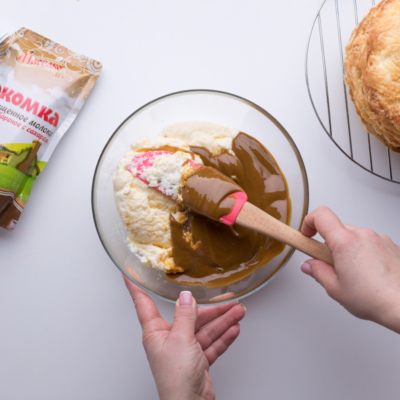 В охлажденный крем добавить вареную сгущенку, перемешать.