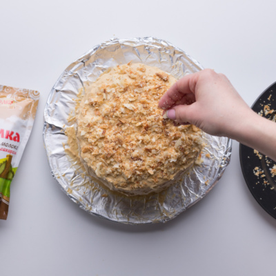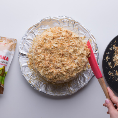 Из отставшегося коржа сделать крошку и покрыть ей торт со всех сторон.