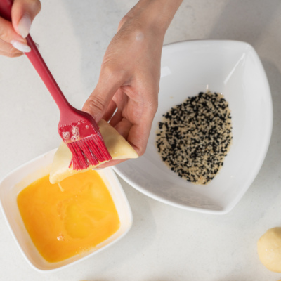 Переложить на противень, застеленный пергаментной бумагой. Верх так же смазать яйцом.