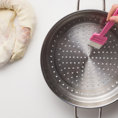 Как только вода в мантышнице закипит, поставить все листы сверху и закрыть крышкой.