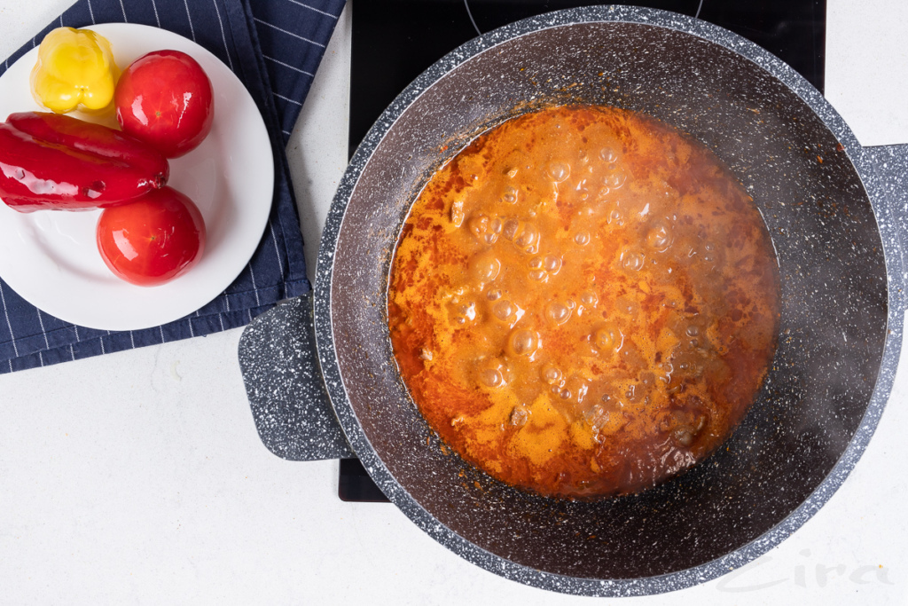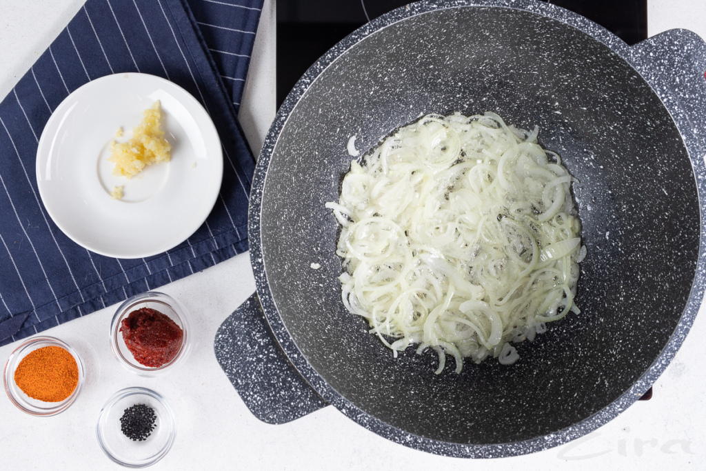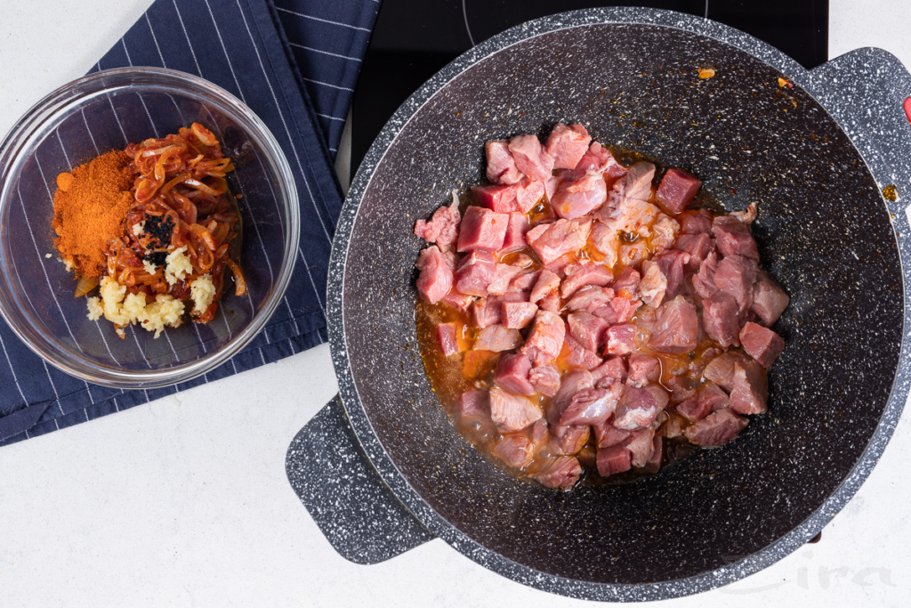 Переложить содержимое казана в отдельную тарелку. Добавить измельченный чеснок, паприку, тмин и перемешать.