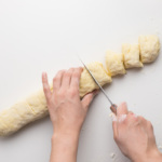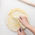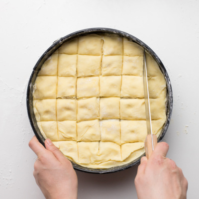 Разделите тесто на 12 или 24 равных кусочков. Количество кусочков зависит лишь от вашего желания, чем больше кусочков, тем больше слоев.