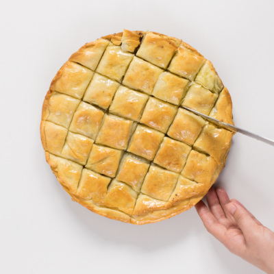 Измельчите в блендере фисташки и украсьте ими верх пахлавы.