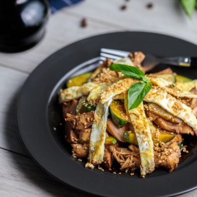 Выложить на тарелку горкой, а сверху - полоски омлета и посыпать кунжутом.