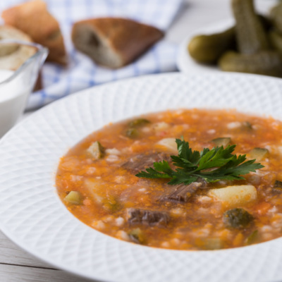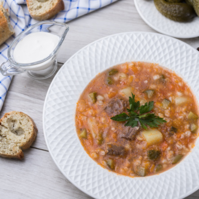 Рассольник — очень популярное первое блюдо. Густой и наваристый суп с перловкой на ароматном говяжьем бульоне.