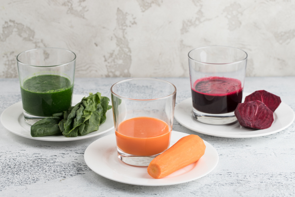Подготовить по 60 миллилитров натурального сока из свеклы и моркови.