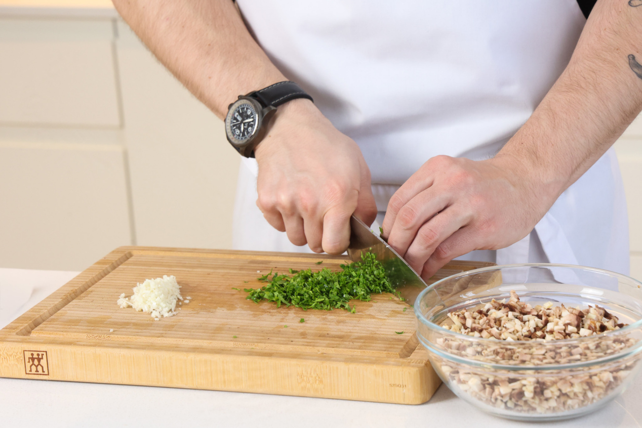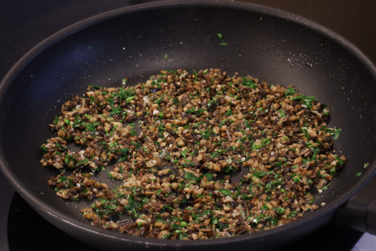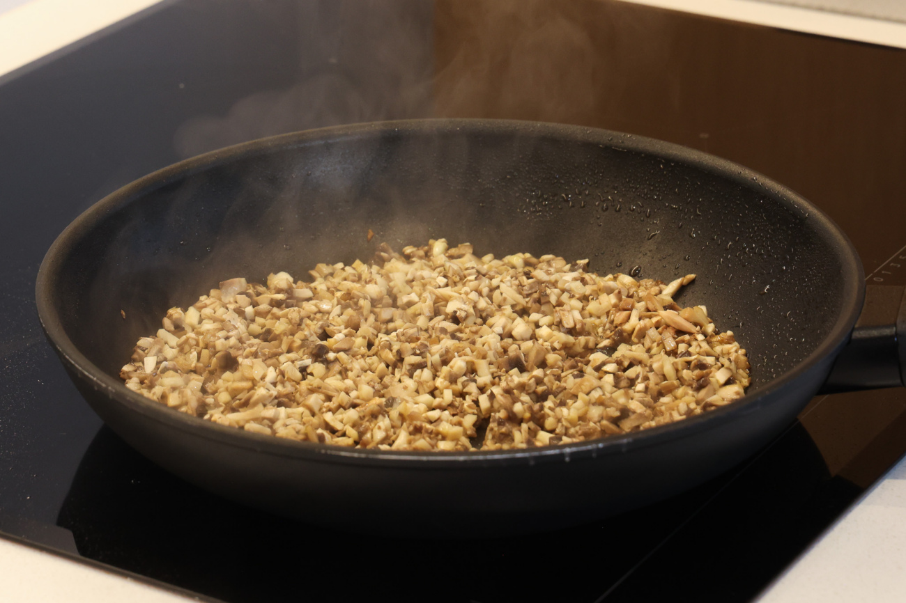 Шампиньоны максимально мелко нарезать, обжарить на небольшом количестве оливкового масла до испарения влаги.