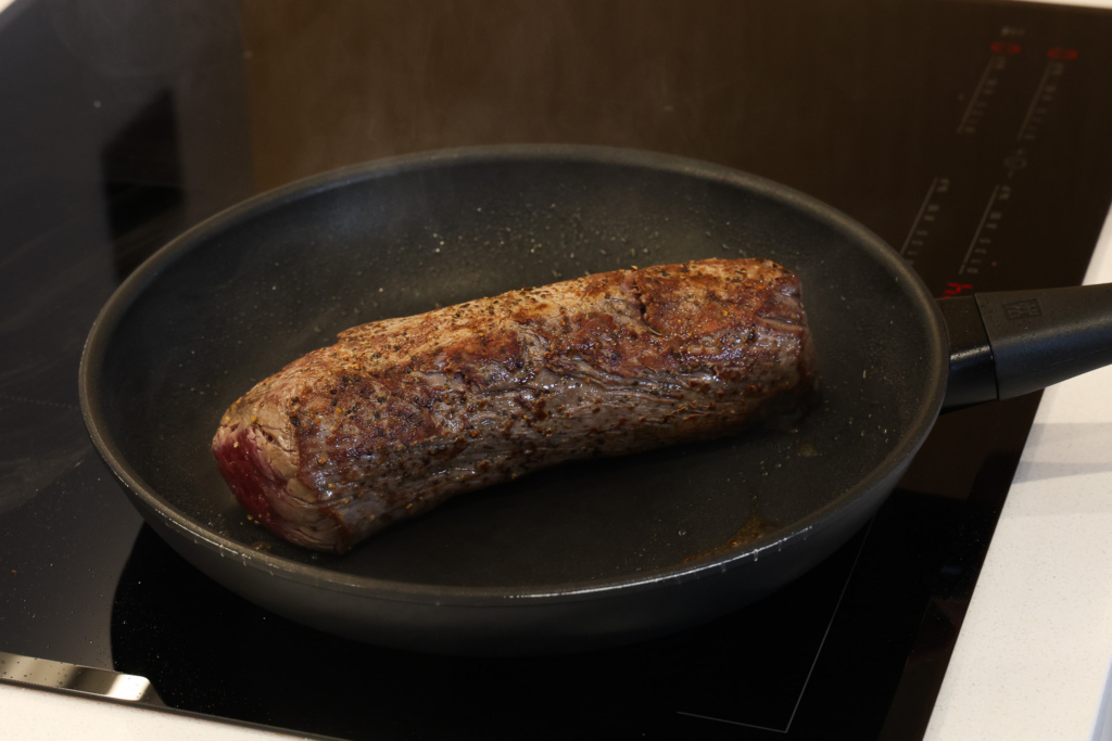 Говядину обжарить целым куском со всех сторон до румяной корочки, не доводя до готовности внутри. Переложить на тарелку и остудить до комнатной температуры.