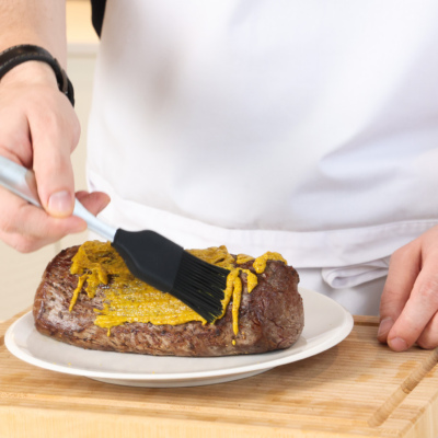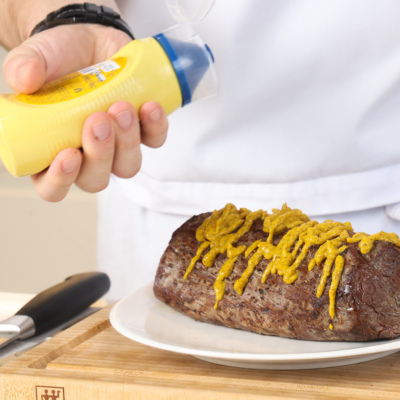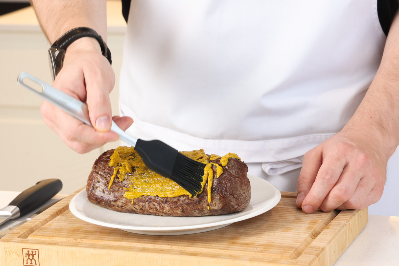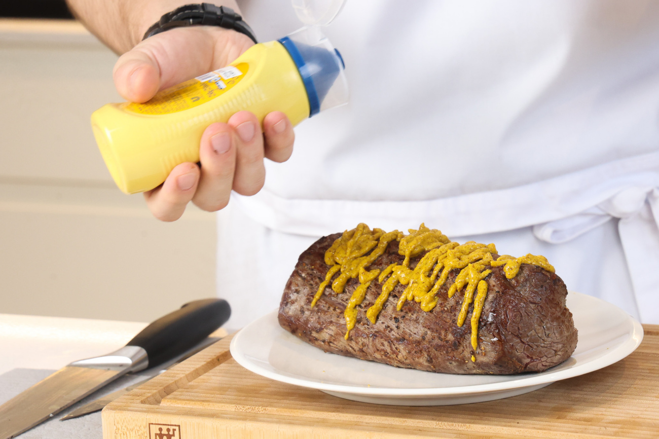 Остывшую говядину равномерно смазать сладкой горчицей — она добавит вкус и станет связующим слоем. Убрать в холодильник.