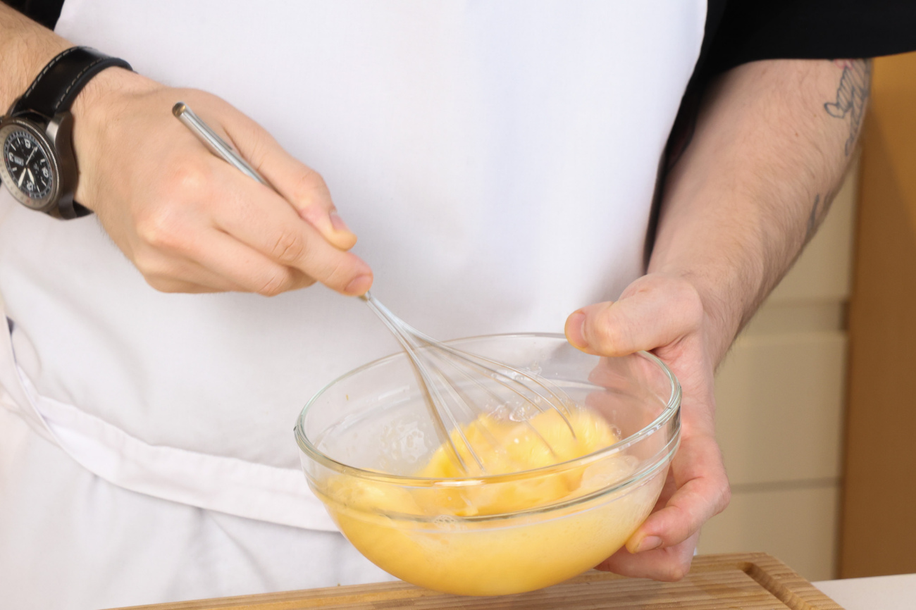 Яйца слегка посолить и взбить вилкой или венчиком.