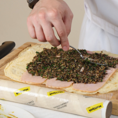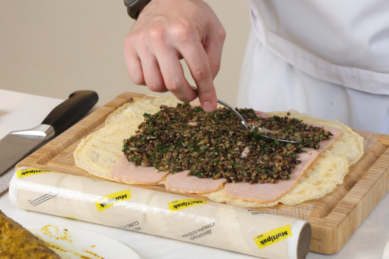 Яичные блинчики выложить внахлест, сверху выложить ломтики индейки, затем грибную начинку, распределив равномерным слоем.