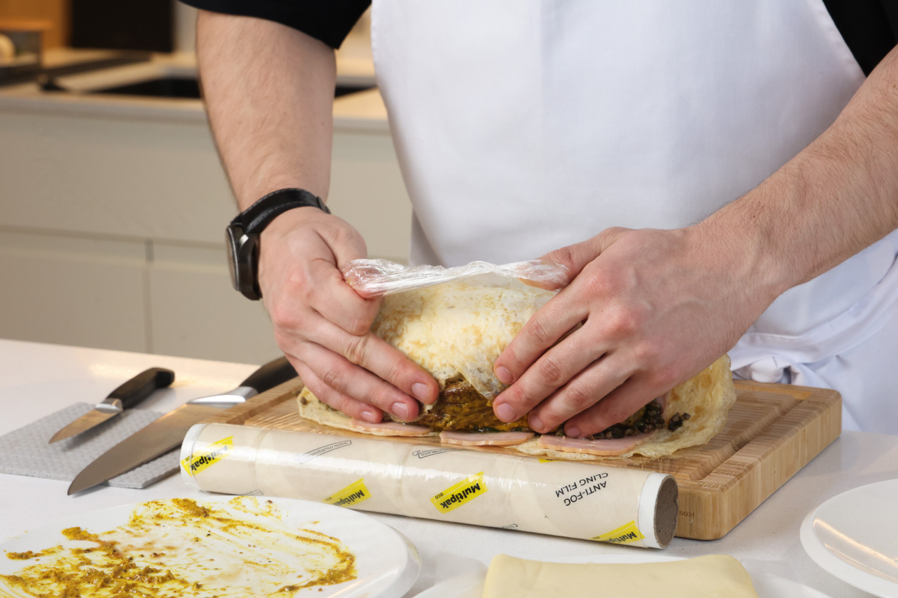 Выложить говядину и с помощью пленки плотно свернуть рулетом, собрав края. Убрать в холодильник на 20–30 минут для стабилизации формы.
