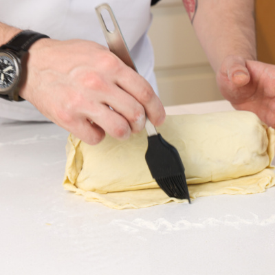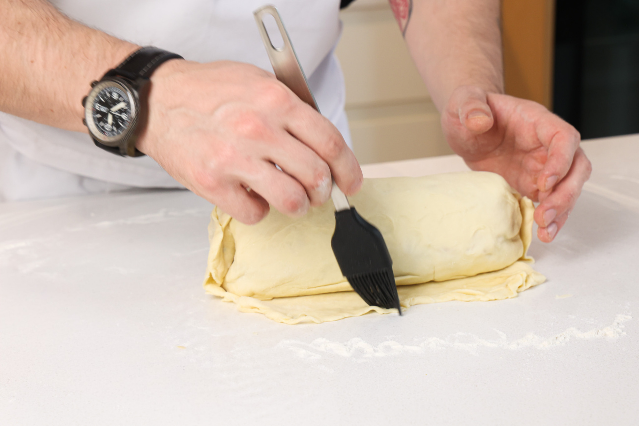 Охлажденный рулет завернуть в половину теста, шов аккуратно защипнуть, смазав желтком и срезав излишки теста. Смазать тесто желтком.