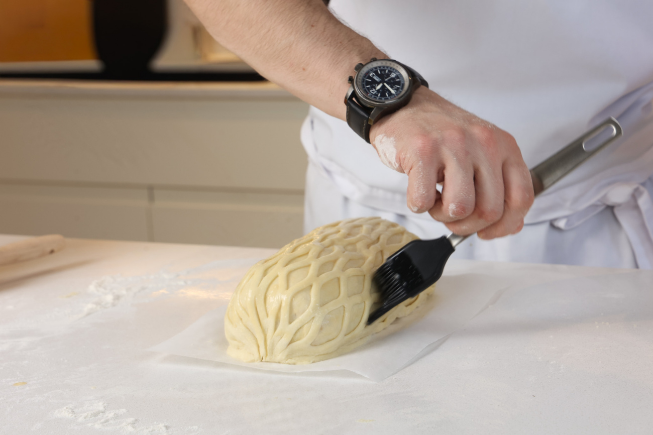 Аккуратно переложить надрезанное тесто на Веллингтон, чтобы получилась красивая сеточка. Смазать сеточку желтком.