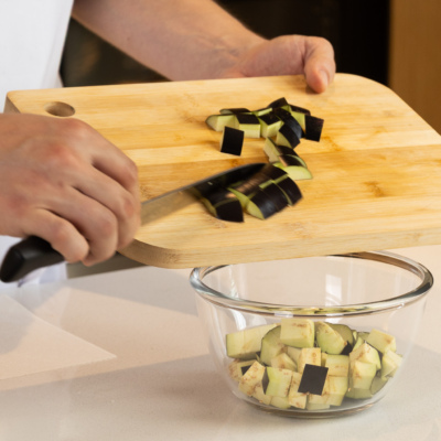 Обжарить баклажан в оливковом масле до мягкости. Добавить чеснок, затем оливки.