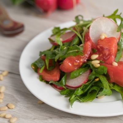 Легкий салат из редиса, рукколы и сладких помидоров станет отличным дополнением к основному блюду из мяса или птицы. Он разбавит ваше меню и добавит нотку пикантности к обеду или ужину.