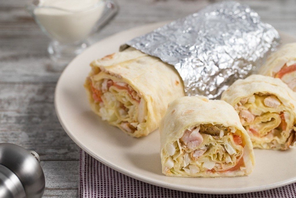 Сегодня предлагаем вам приготовить рулет из лаваша с пекинской капустой и курицей. Получается невероятно нежно и сочно!