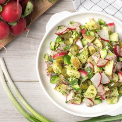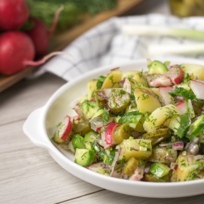 Простой и сытный, с пикантными нотками корнишонов и редиса, этот салат весьма хорош в теплом виде, хотя и холодным он вам тоже понравится.