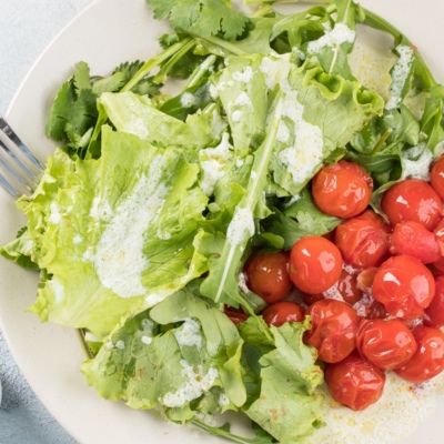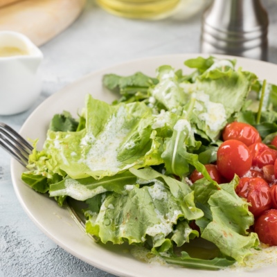 Готовые помидоры выложить на тарелку, полить их йогуртовой заправкой, сверху выложить микс салатных листьев. Сбрызнуть оливковым маслом.