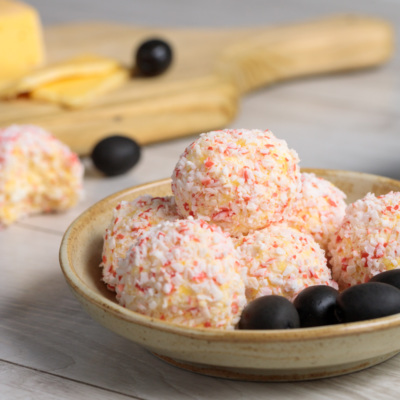 Все шарики из сыра обвалять в посыпке из крабовых палочек. Обязательно следите за тем, чтобы посыпка равномерно облепила шарик со всех сторон.