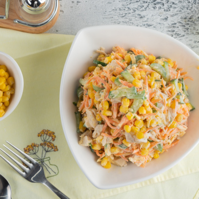 Смешать курицу, морковь, огурец, кукурузу и сыр.