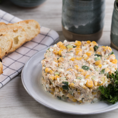 Он получается необычным и свежим благодаря сочетанию тунца, огурцов и кукурузы. В качестве заправки мы использовали сметану, которая с успехом заменила майонез.