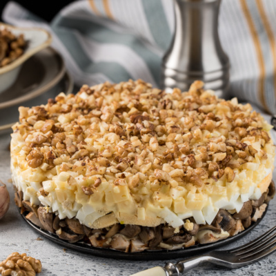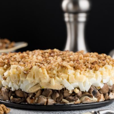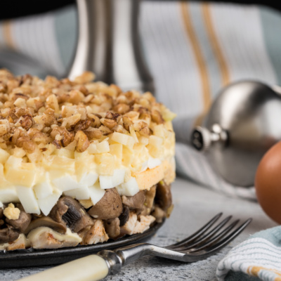 Этот сытный салат разнообразит ваш праздничный стол благодаря интересной нотке грецкого ореха. Главным его преимуществом является то, что его можно приготовить заранее.